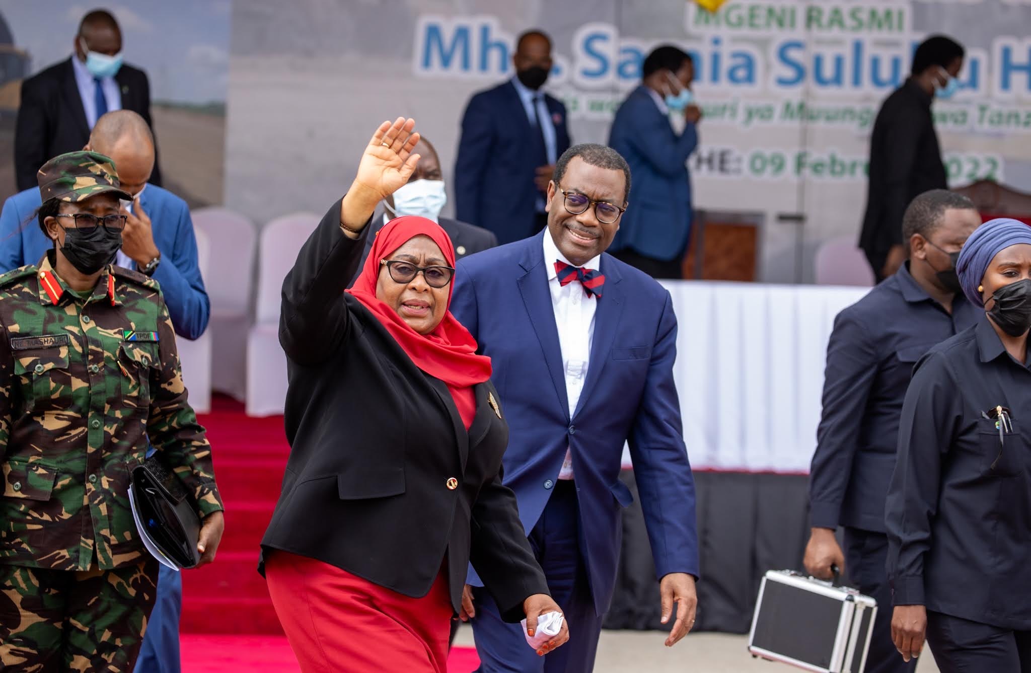 Samia Suluhu Hassan, présidente de la République unie de Tanzanie, avec à ses côtés le président Akinwumi Adesina, lors de la pose de la première pierre de la rocade extérieure de Dodoma, en février dernier.